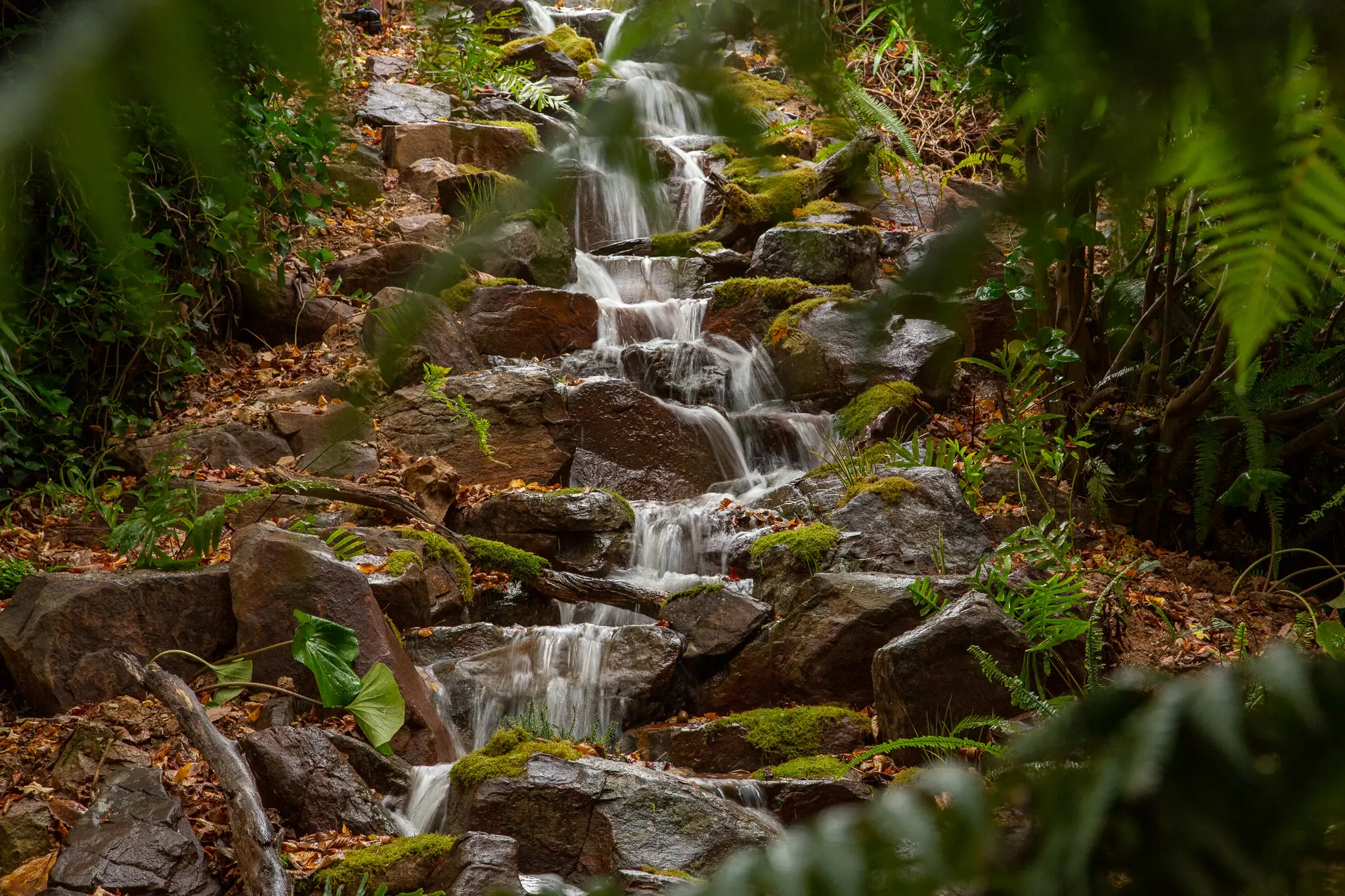 A naturalistic stream and cascading waterfall feature designed…